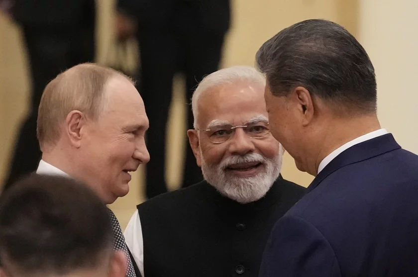 Na fota, zroblenym, vidavočna, padčas niadaŭniaha samitu Šanchajskaj arhanizacyi supracoŭnictva ŭ Kitai, kitajski lidar Si Czińpin vychodzić ź dźviarej z prezidentam Rasiei Uładzimiram Pucinym, za imi idzie premjer-ministr Indyi Narendra Modzi.