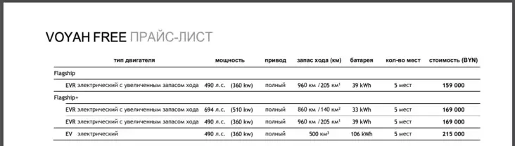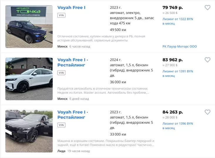 Z kitajskich brendaŭ na našym rynku lidziruje Voyah z madellu Free. Aproč elektramatora, jaki pryvodzić u ruch koły, aŭtamabil maje pad kapotam 1,5-litrovy bienzinavy ruchavik, jaki vykonvaje rolu hienieratara, što zaradžaje batareju.