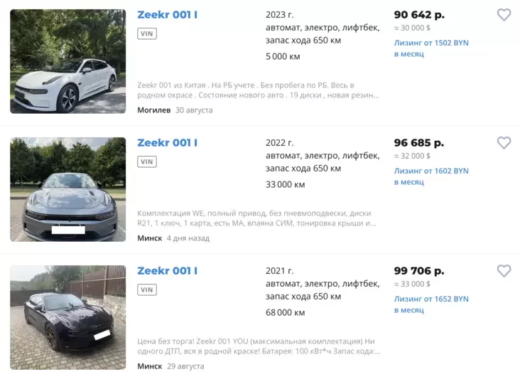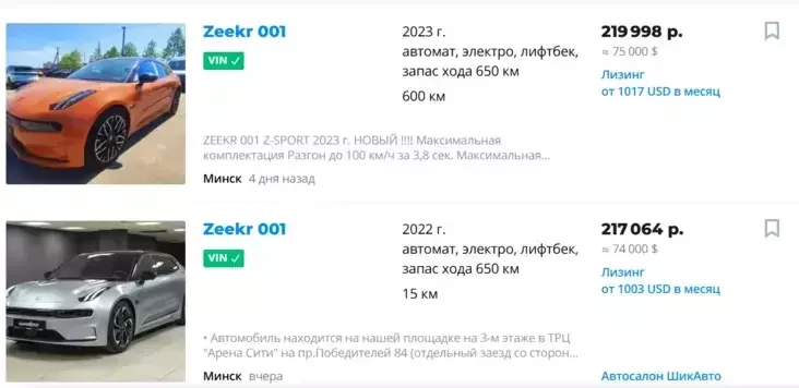 Na prykładzie taho ž Zeekr možna ŭbačyć, jak viasnoj 2023 hoda takija mašyny pradavalisia za 74-75 tysiač dalaraŭ. Ciapier reštki novych Zeekr 001 (2024 hoda vytvorčaści) pradajuć za 45-51 tysiaču dalaraŭ.