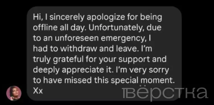 «Na žal, praź niepradbačanuju nadzvyčajnuju situacyju mnie daviałosia admovicca ad udziełu i źjechać. Mnie vielmi škada, što ja prapušču hety asablivy momant», — adkazała artystka ŭ paviedamleńniach u instahramie.