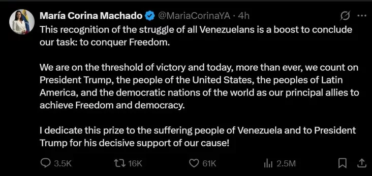 Lidarka vieniesuelskaj apazicyi Maryja Karyna Mačada, jakoj siońnia prysudzili Nobieleŭskuju premiju miru, pryśviaciła atrymańnie ŭznaharody narodu Vieniesueły i prezidentu ZŠA Donaldu Trampu.
