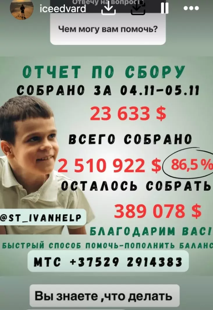 U adkaz na adno z pytańniaŭ — «Čym mahu vam dapamahčy?» — jon raźmiaściŭ zaklik ab dapamozie ŭ zbory hrošaj na lačeńnie Vani Ściacenki, u jakoha ciažkaja hienietyčnaja chvaroba — mijadystrafija Dziušena.