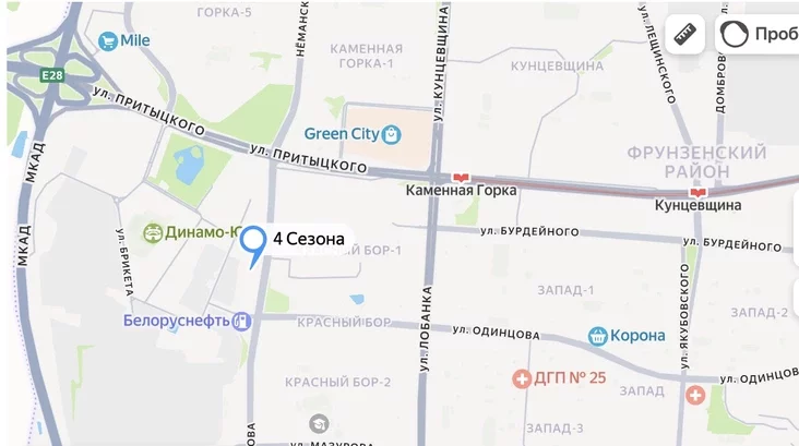 HC «4 siezony» adkryŭsia pa adrasie Skrypnikava, 47. Heta niedaloka ad MKAD, u rajonie vulic Prytyckaha, Adzincova i Mazurava. Ad stancyi mietro «Kamiennaja Horka» — krychu mienš za kiłamietr.