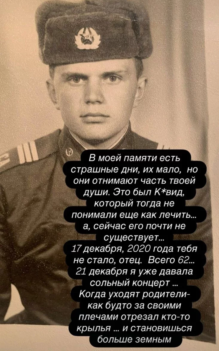 «U majoj pamiaci jość strašnyja dni, ich mała, ale jany adbirajuć častku dušy. Heta byŭ kavid, jaki tady nie razumieli, jak lačyć… A zaraz jaho amal nie isnuje. 17 śniežnia 2020 hoda ciabie nie stała, baćka. Usiaho 62…», — raspaviała Alena ŭ storys u instahramie.