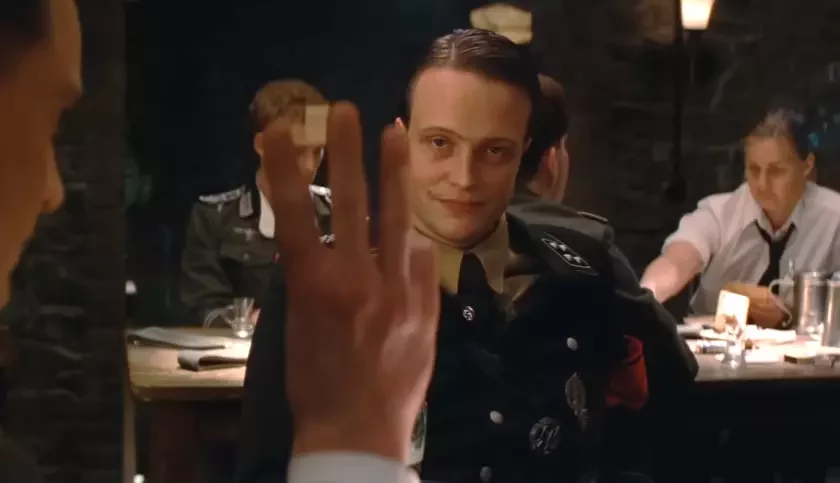 Gestapo Sturmbannführer (August Diehl) finds the guest's accent suspicious, and he sits down at the table to find out the truth. The critical moment comes when the agent orders whiskey: with the words «drei Gläser» («three glasses»), he shows the waiter three fingers in the English manner—without the thumb. For the German, this gesture becomes the detail that confirms the correctness of his assumptions. It all ends in a brutal Tarantino-style shootout in the bar, in which almost everyone present dies.