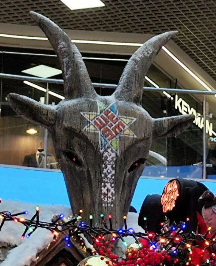 In reality, it is a large goat mask—an obligatory attribute of traditional folk caroling, when young people and children led a goat dressed in a sheepskin coat and with a corresponding mask (and sometimes a bear or a mare) from house to house. The star on the goat's forehead symbolizes the Star of Bethlehem. And such a "symbol of Satanism" as an ornament is present on the official state flag.