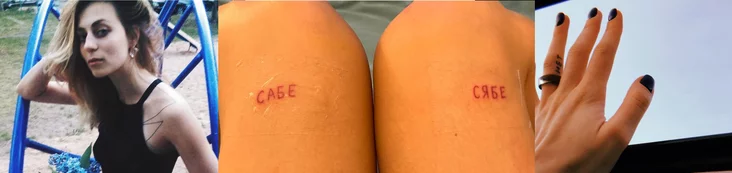 I got the third tattoo in Warsaw, in the summer of 2024. I wanted to keep something warm and Belarusian on myself. But not a map, not a flag — for me it's quite a slogan, something more intimate. And then I remembered the words «sabe-syabe», which are constantly confused. And it's not clear: are you taking for yourself or giving yourself away? So I got the last tattoo at the moment on my knees.