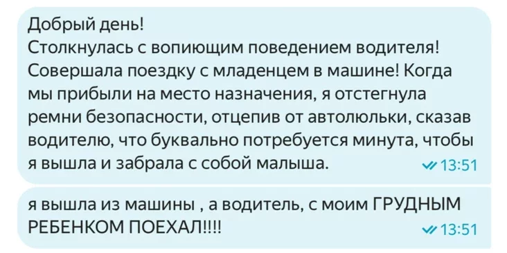 "Yandex support only called with apologies. They clarified whether we would contact law enforcement. My husband and I consulted â it turns out we can't even file a private complaint against the person who provides the transport service. That is, there was no alleged intentional 'kidnapping' of the child," says the interlocutor.
