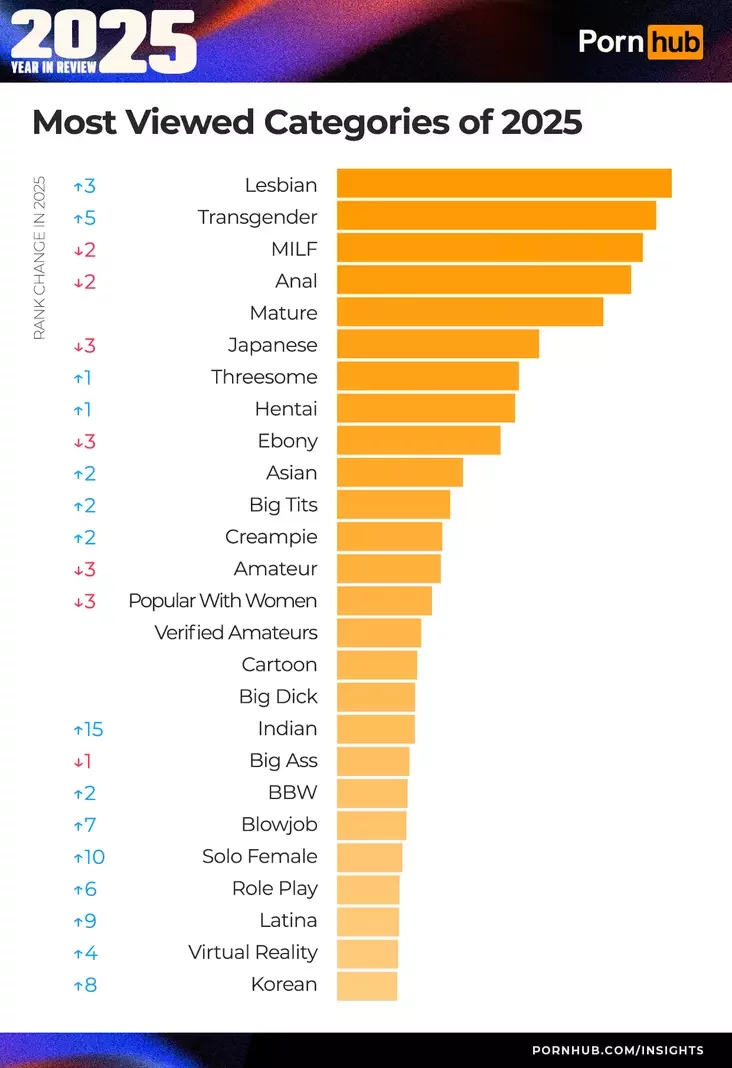 The «Lesbian» category took the lead in the global ranking. Compared to last year, it climbed three positions. However, last year's favorite — videos with «MILFs» (women aged 33-44) — dropped to third place.