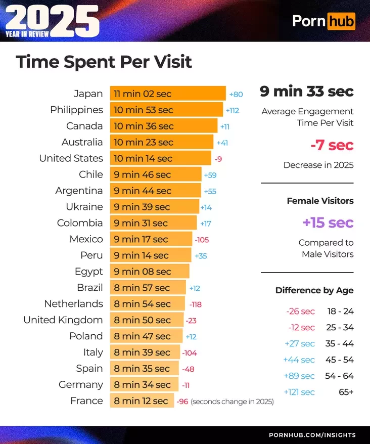 The average viewing time worldwide was 9 minutes 33 seconds, which is 7 seconds less than a year ago. However, female visitors spent an average of 15 seconds more on the site than men.