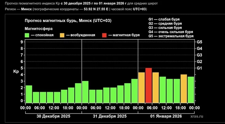 A magnetic storm of G1 level is expected on the night of December 31 to January 1, reports the Laboratory of Solar Activity.
