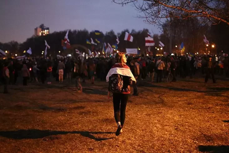 Участники скандируют «Россия — оккупант!», поют «Мы выйдзем шчыльнымі радамі».