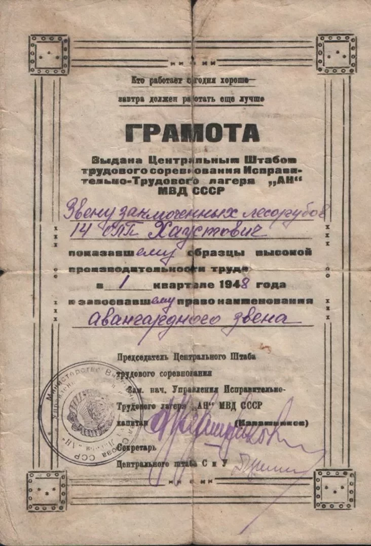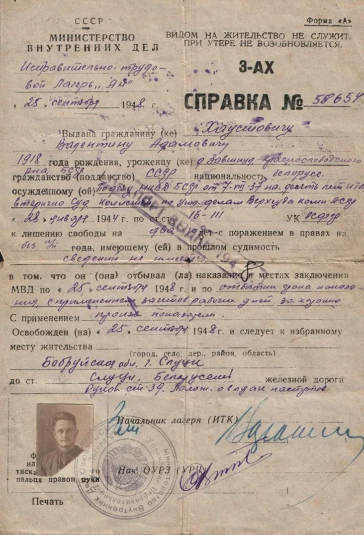 Освобожден 25 сентября 1948 г. «Заработанных» 165 руб. 38 коп. хватило на билет до Слуцка. Привез на родину грамоту («Кто работает сегодня хорошо — завтра должен работать еще лучше») и болезни, от которых и умер в 69 лет.