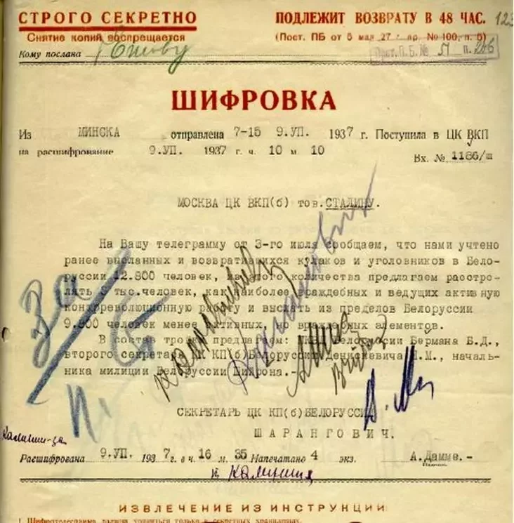 Дальнейшую его судьбу, как оказалось, определили высокие партийные чины. 9 июле 1937 г. Василий Шарангович, отвечая на телеграмму Сталина, написал следующее: «…нами учтено ранее высланных и возвратившихся кулаков и уголовников в Белоруссии 12.800 человек, из этого количества предлагаем расстрелять 3 тыс. человек, как наиболее враждебных и ведущих активную контрреволюционную работу и выслать из пределов Белоруссии 9.800 человек менее активных, но враждебных элементов» (документ из блога Глеба Лободенко).