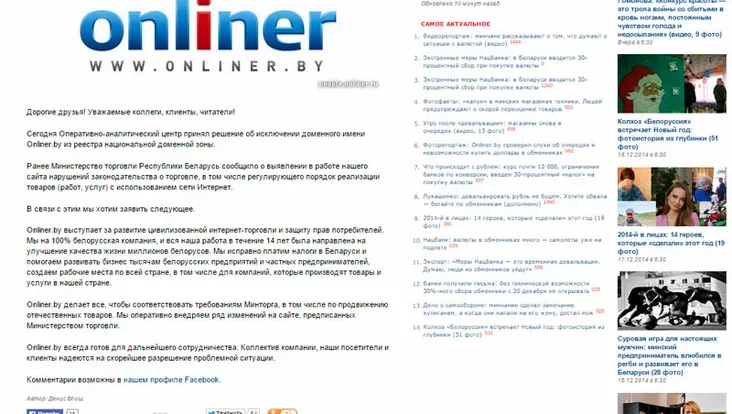 Сегодня Оперативно-аналитический центр принял решение об исключении доменного имени Onliner.by из реестра национальной доменной зоны.