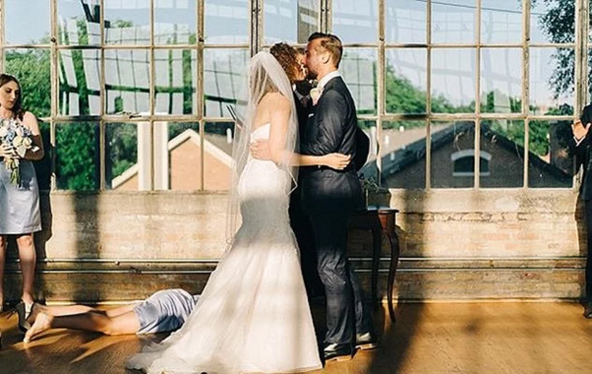 Соцсети облетела свадебная фотография, на которой запечатлены молодожены в момент объявления их мужем и женой, сообщает The Daily Mail. Снимок примечателен тем, что у ног новообразовавшейся семейной пары лежит без сознания гостья церемонии.