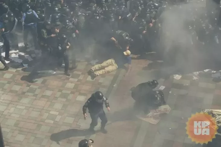 У здания Верховной Рады в Киеве, где произошли столкновения милиции и демонстрантов. Более трех тысяч митингующих протестовали против придания Донбассу особого статуса в рамках закона о децентрализации власти. Прогремел взрыв.