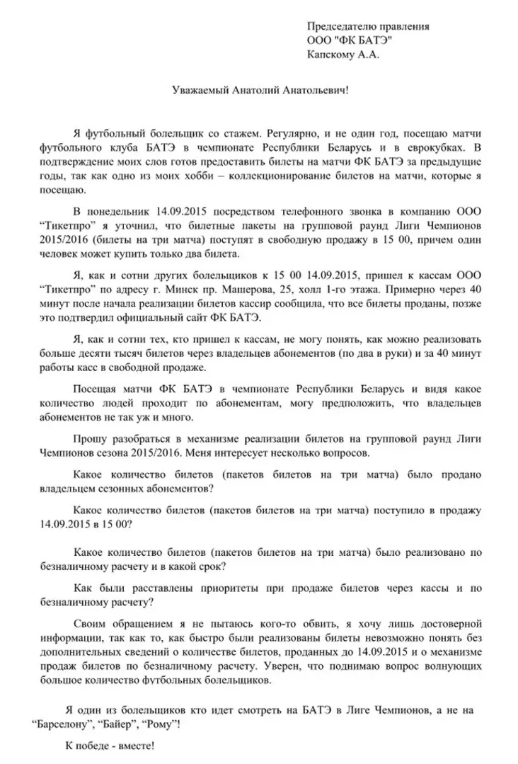 В распоряжении Tribuna.com оказалась копия письма, которое написал болельщик БАТЭ председателю правления клуба Анатолию Капскому.