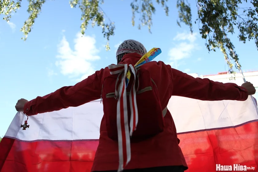 К акции присоединилась активистка Наталья Горячко-Басалыга с БЧБ-флагом.