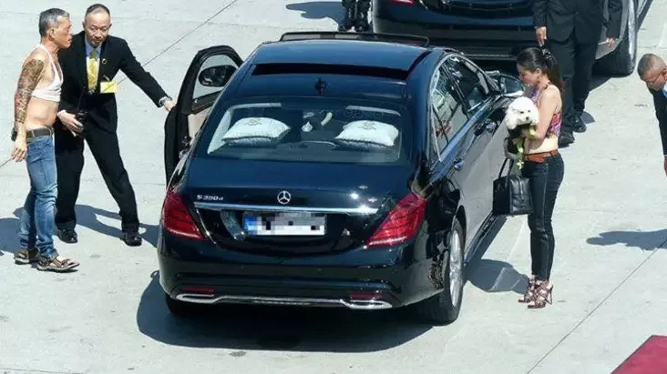 Облик 63-летнего наследника престола Таиланда Махи Вачиралонгкорна удивил пользователей интернета. Принц Таиланда, спускаясь с трапа самолёта с женой, держал в руках белого пуделя, а сам был одет в сандалии и белый топик, который обнажил его татуировки.