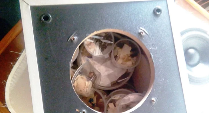 При разборке акустической системы в ней были обнаружены пластиковые контейнеры с 46 змеями: различных размеров гадюки и питоны.