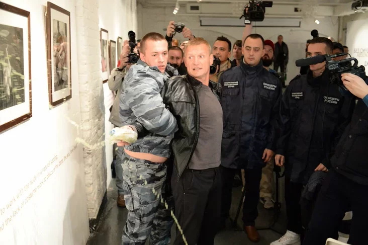 Активисты общественной организации «Офицеры России» нейтрализовали хулигана. Перед тем как облить фотографии, злоумышленник заявил, что экспозиция «оскорбляет семейные ценности и провоцирует педофилию».