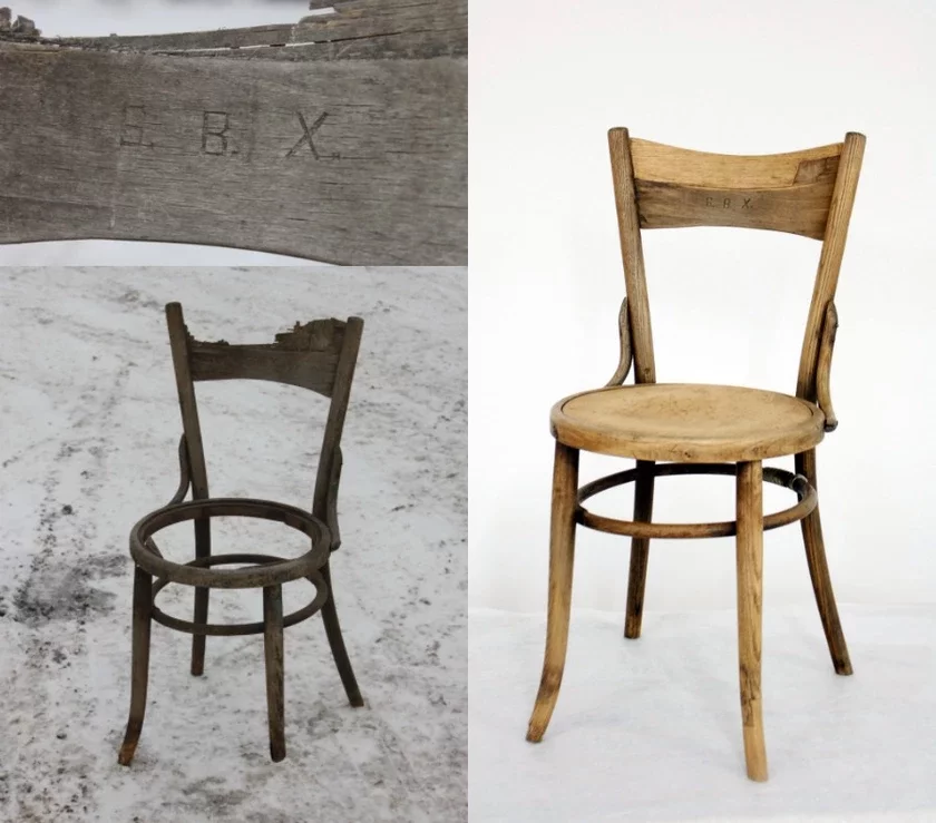 Когда-то этот венский стул находился в Бычковской панской усадьбе. После революции там открыли школу, и на нем сидел учитель. Позже школу закрыли и местные жители разобрали то, что в ней оставалось. Василь Быков с сестрой Валентиной тоже пошли в усадьбу и принесли этот стул. А чтобы никто не заподозрил, что стул вынесли из школы, Василь, по заданию отца, вырезал с обеих сторон на спинке его инициалы «Б.В.Х.» — Быков Владимир Хведарович [Федорович].