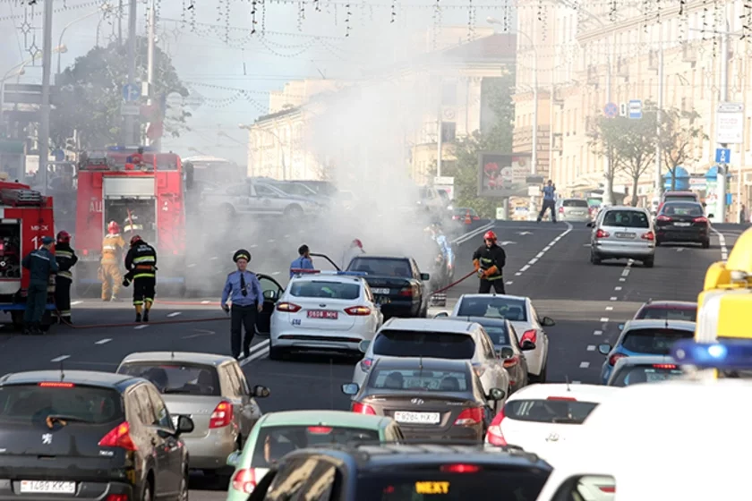 Возгорание произошло в районе моторного отсека автомобиля «Мерседес-Бенц». Легковушка встала в крайней левой полосе на участке пр. Независимости между пл. Победы и ул. Козлова.