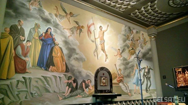 На стенах храма можно увидеть ангелов с саксофонами и дудой, политиков и библейские мотивы в современных реалиях.