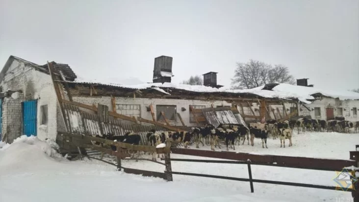 Из-за снега обрушилась часть стропильной системы шиферной кровли на молочно-товарной ферме 1970 года постройки в деревне Пацева Слобода Кировского района Могилевской области. Сообщение в МЧС поступило 10 марта в 09:23. Под тяжестью снега обрушилось 180 квадратных метров кровли. Пострадавших нет, уточнили в Могилевском областном управлении МЧС.