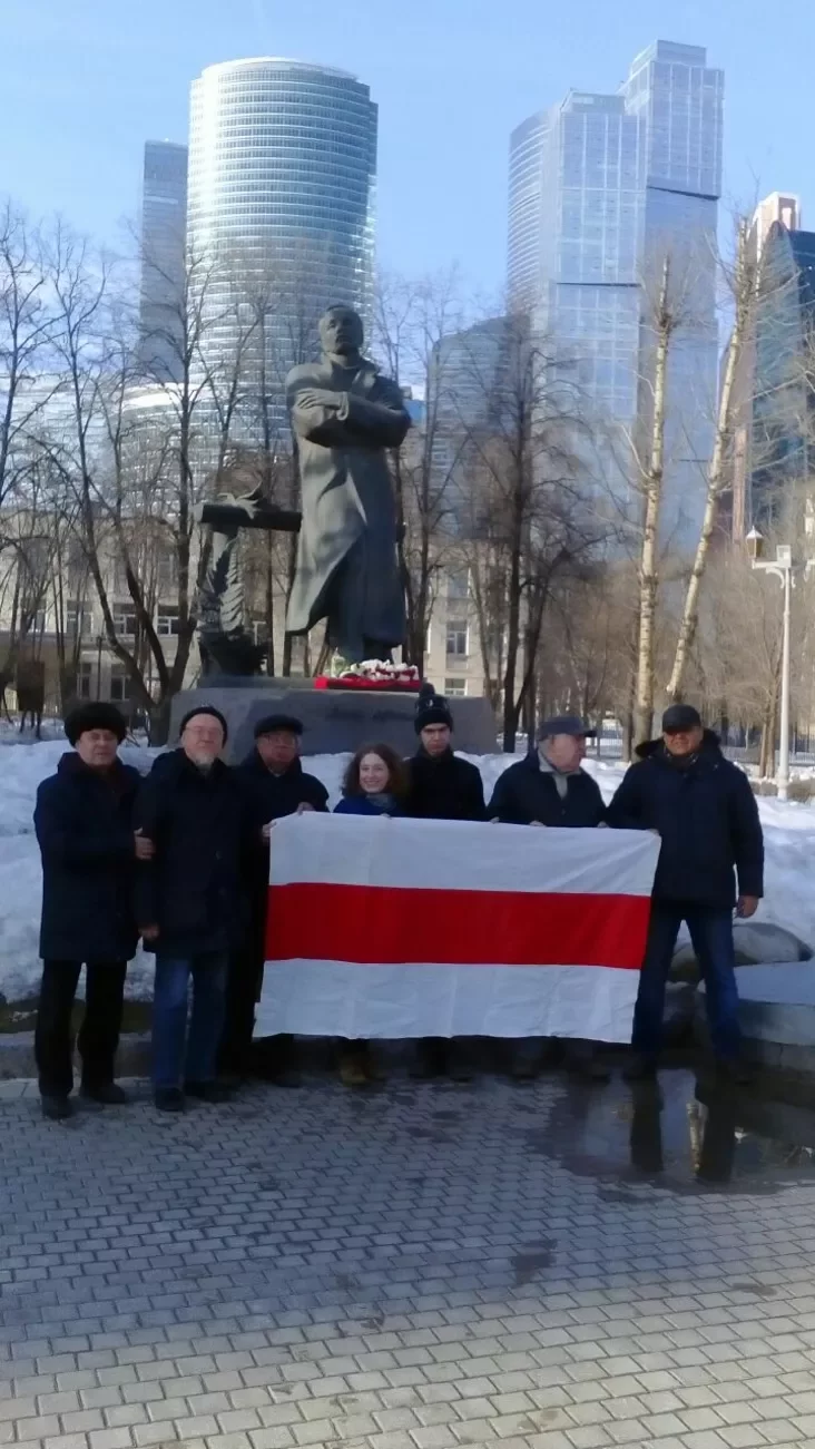 Участники празднования в Москве собрались возле памятника Янке Купале на Кутузовском проспекте. Они возложили бело-красно-белые цветы к ногам Песняра.