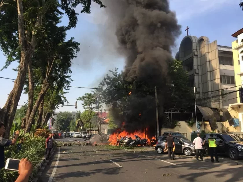 Первый взрыв в воскресенье, 13 мая, прогремел рядом с католической церковью Святой Марии в городе Сурабая на острове Ява в 7:15 утра по местному времени (разница с Минском — 2 часа), последующие два взрыва произошли с интервалами около пяти минут в том же городе. Второй взрыв прогремел в протестантской церкви, третий — в церкви пятидесятников.
