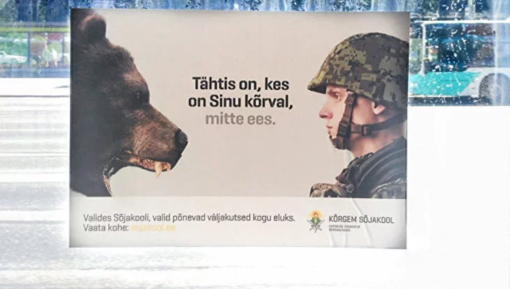 Высшая военная школа Объединенных учебных заведений Сил обороны Эстонии выпустила рекламу, в которой российский танк Т-90 рассыпается в прах под неподвижным взглядом эстонского солдата. Этот же солдат в ролике противостоит медведю.