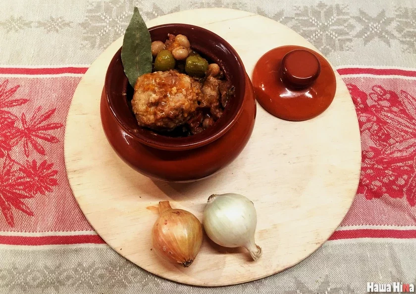Грибы заливаем 500 мл теплой воды. Тем временем мелко нарезаем лук. В кастрюле разогреваем 2 ст. л. растительного масла, выкладываем туда лук, лавровый лист, гвоздику, паприку и жарим, пока лук не станет прозрачным. Добавляем ложку муки и жарим еще две минуты. Грибы нарезаем, воду из-под грибов сохраняем. Подливаем к луку уксус, вино, томатный сок, воду из-под грибов, добавляем грибы и оливки. Ждем, пока соус закипит, и аккуратно выкладываем в него наши фрикадельки. Уменьшаем огонь, солим, перчим, добавляем мускатный орех по вкусу, накрываем крышкой и тушим минут 40. В конце добавляем консервированную фасоль, даем вместе повариться минут пять.