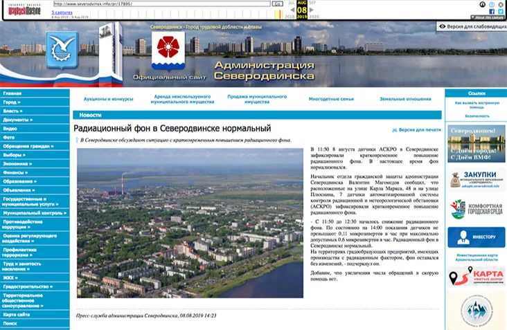«В 11:50 8 августа датчики АСКРО в Северодвинске зафиксировали кратковременное повышение радиационного фона. В настоящее время фон нормализовался. <…> С 11:50 до 12:30 началось снижение радиационного фона. По состоянию на 14:00 показания датчиков не превышают 0,11 микрозиверта в час при максимально допустимых 0,6 микрозиверта в час. Радиационный фон в Северодвинске нормальный», — говорилось в нем. Копия страницы сохранилась в архиве Wayback Machine.