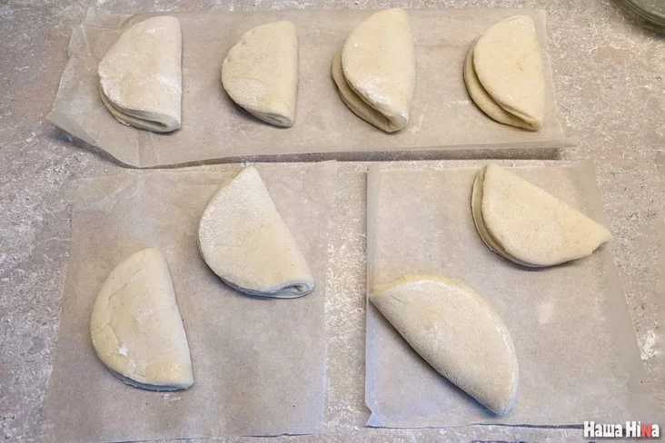 Тесто месим и раскачиваем на поверхности, которую немного присыпаем мукой. Стаканом вырезаем кружки. Их может быть от 6 до 10 в зависимости от диаметра вашего стакана. Каждый кружок смазываем маслом и складываем пополам. Булочки накрываем полотенцем и оставляем еще на 10-15 минут — они должны немножечко подняться.