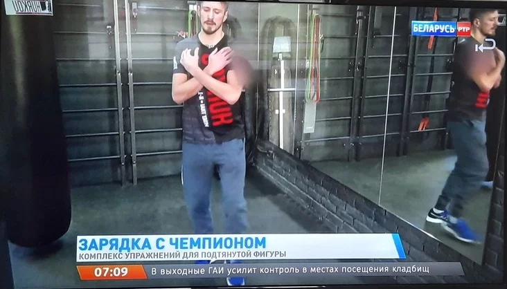 В пятницу, 24 апреля, в утренней передаче на телеканале «РТР-Беларусь» показали зарядку со спортсменом Виталием Гурковым. В эфире он был в серой футболке с «Погоней» на рукаве. Однако зрители этого не увидели: герб на видео… просто «замазали».