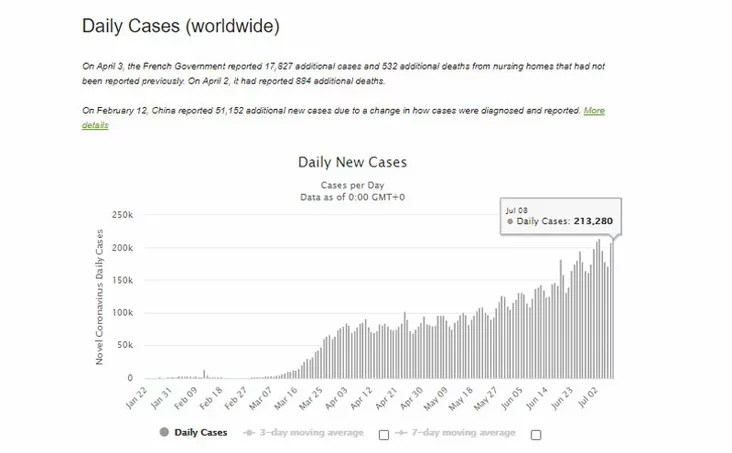 За вчера заболели 213 380 человек. Перед этим рекорд был 213 778 (3 июля). Умерли вчера 5 518 человек (всего 552 тысячи)