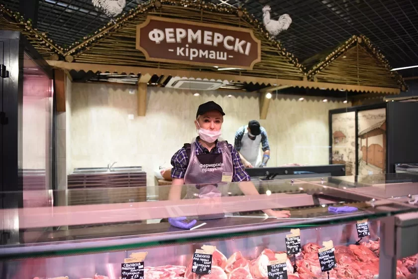 Площадки с натуральным деревенским мясом оформлены в стиле сельского подворья и обозначены вывеской «Фермерскiя прадукты».