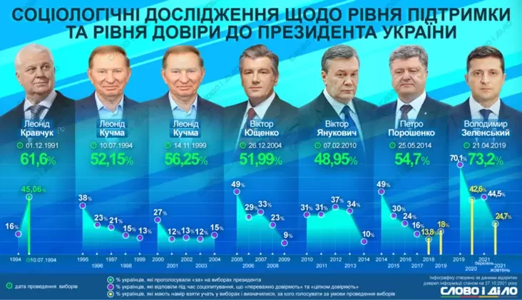 В состоявшемся 31 марта 2019 года первом туре президентских выборах в Украине за Зеленского проголосовали 30,24% избирателей, за его оппонента Порошенко — 15,95%. Во втором туре, который состоялся 21 апреля, за Зеленского проголосовали 73,22% украинцев, за Порошенко — 24,45%. Поддержка Зеленского тогда стала рекордной за всю историю выборов украинского президента.