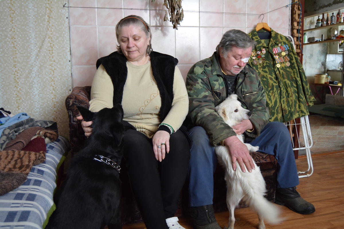 58-летний десантник-орденоносец Олег Ляшенко с женой Мариной и целым выводком спасенных собак живут в половине дома в Ольховцах под Ляховичами. Переехали сюда из Минска вынужденно, вследствие хронических болезней женщины. Дети остались в столице. Расчет облагородить деревенское жилье застопорила банальная причина — денежная. Поэтому условия очень спартанские.