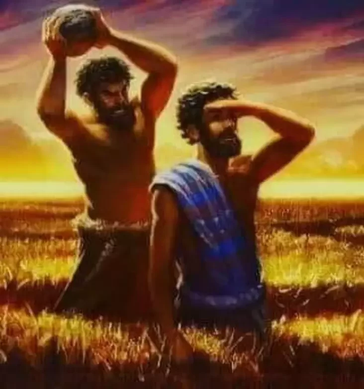 К тексту автор приложил рисунок, на котором Каин убивает брата. «Каин сказал своему брату Авелю: «Пойдем в поле». Когда они были в поле, Каин набросился на своего брата Авеля и убил его».