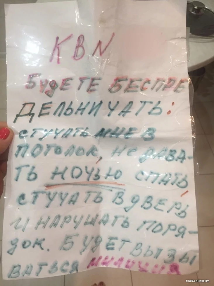 В редакцию издания «Онлайнер» обратились жители Минска, которые уже не первый месяц конфликтуют со своей соседкой. По их словам, она оставляет в подъезде записки, стучит по ночам по стенам, регулярно вызывает на других жильцов милицию и даже отключает в их квартирах электричество. Как оказалось, они далеко не первые, кто с этим столкнулся: женщина поменяла уже пять адресов, и везде случалось нечто подобное.