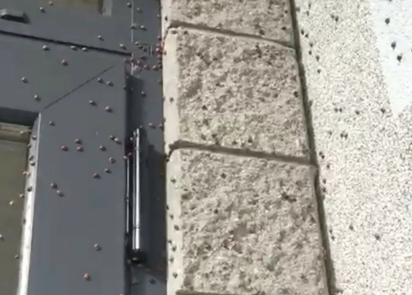 «В деревне около Михановичей нашествие божьих коровок», — написал читатель издания и выслал в доказательство видео. Насекомые облепили фасад здания, плитку, водопроводную трубу, забор и окна.