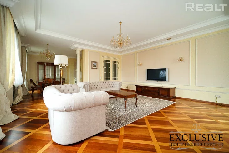 В квартире итальянская мебель и люстры с кристаллами Swarovski, картины, паркет, современная бытовая техника и элитная сантехника.