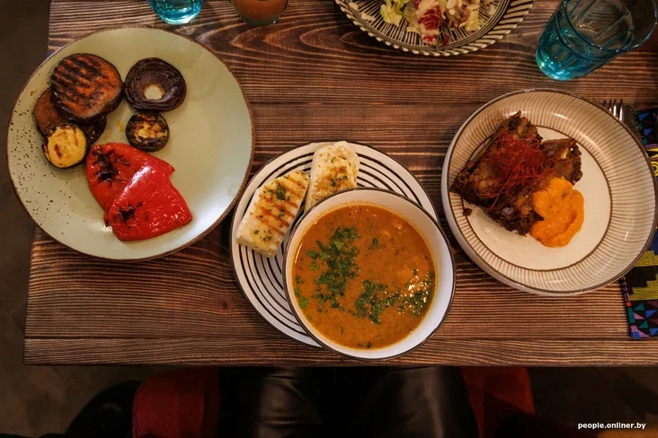 — И соус к ней идет аутентичный африканский, довольно острый. Арахисовый суп у нас тоже готовится на основе арахисового соуса. Вообще, в Африке он довольно популярен, много куда идет. Добавляем в блюда кокос, миндальные лепестки. Планируем внедрять браай. Это популярное в южной Африке блюдо — мясо, приготовленное на открытом огне. Мы будем готовить его на гриле и миксовать с овощами. Еще у нас есть чакчука (яйца, запеченные с овощами. — Прим. Onlíner). В Минске это блюдо больше известно как шакшука, но мы назвали на алжирский манер, потому что оно родом из Северной Африки.