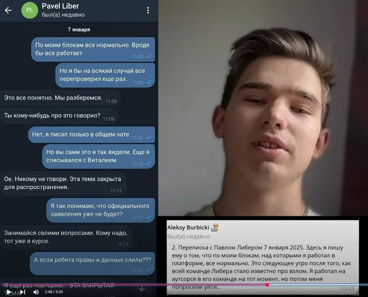 На ютуб-канале блогера Сергея Петрухина вышло видео с обвинением Павла Либера в замалчивании факта взлома платформы «Новая Беларусь» и утечке личных данных пользователей. Главный автор обвинений — 17-летний Алексей Бурбицкий, который представляет себя как молодого стартапера в Европе и называет себя экс-сотрудником команды Либера, который «с 2024 года работал на аутсорсе на волонтерских началах, разрабатывая небольшие программные модули».