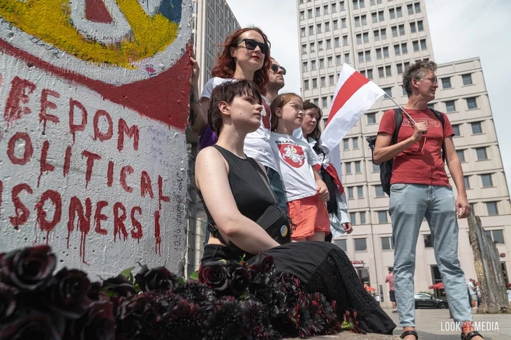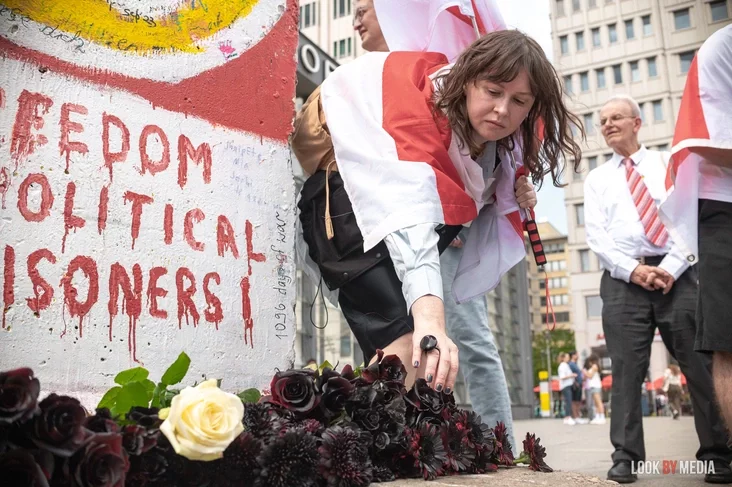 Участники принесли цветы черного цвета и положили их около белорусского куска Берлинской стены, установленного в 2020 году как символ траура и надежды.