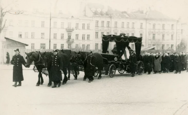 Все эти фотографии сохранились благодаря семейному альбому Мирославы Русак, которая сберегла уникальные свидетельства того дня. В небольших по размеру, но выразительных кадрах предстает скорбное шествие, во главе которого ехал роскошный катафалк, на котором стоял гроб с покойником, покрытый бело-красно-белым флагом. Не автомобиль, а настоящая черная колесница с балдахином из черного бархата, в которую были запряжены четверо лошадей с черными вуалями на оглоблях. Лошадей вели четверо мужчин в длинных шинелях с большими пуговицами и двууголках на головах, еще двое шли по обе стороны гроба.