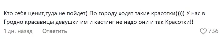 «Кто себя ценит, туда не пойдет. По городу ходят такие красотки! У нас в Гродно красавицы девушки, им и кастинг не надо. Они и так красотки!»